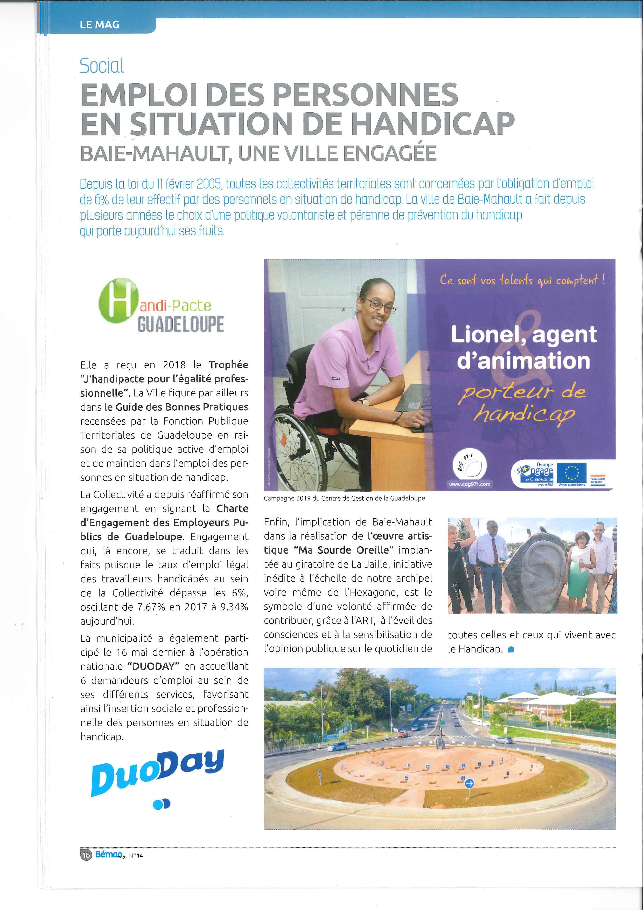 Le FIPHFP et l’équipe Handi-Pacte remercient la Ville de BAIE-MAHAULT pour cet article paru dans son magazine bimestriel Bémao Mag de Juillet Août 2019, qui met en exergue une nouvelle fois son implication dans l’animation de la politique handicap.
