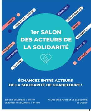 La préfecture de la région Guadeloupe et le conseil départemental de la Guadeloupe organise le premier salon des acteurs de la solidarité les jeudi 15 et vendredi 16 décembre 2022 au Palais des Sports et de la culture du Gosier. Ce salon est ouvert aux acteurs professionnels et bénévoles de la solidarité en Guadeloupe.