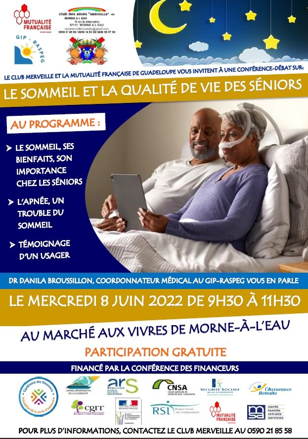 La Mutualité Française de Guadeloupe en partenariat avec le Club Merveille de Morne-à-l'Eau Club Merveille Mornalo et le GIP RASPEG a le plaisir de vous inviter à une conférence sur "le sommeil et la qualité de vie des séniors"